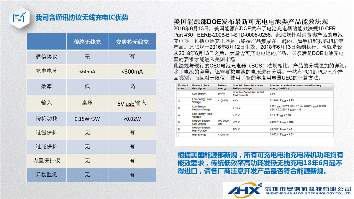 我司無線充電IC方案具有體高、成本優(yōu)勢明顯、應用電路簡單等特點,發(fā)射和接收IC集成度高,帶有通訊協(xié)議,具有異物識別、過充保護、過放保護、短路保護等功能。